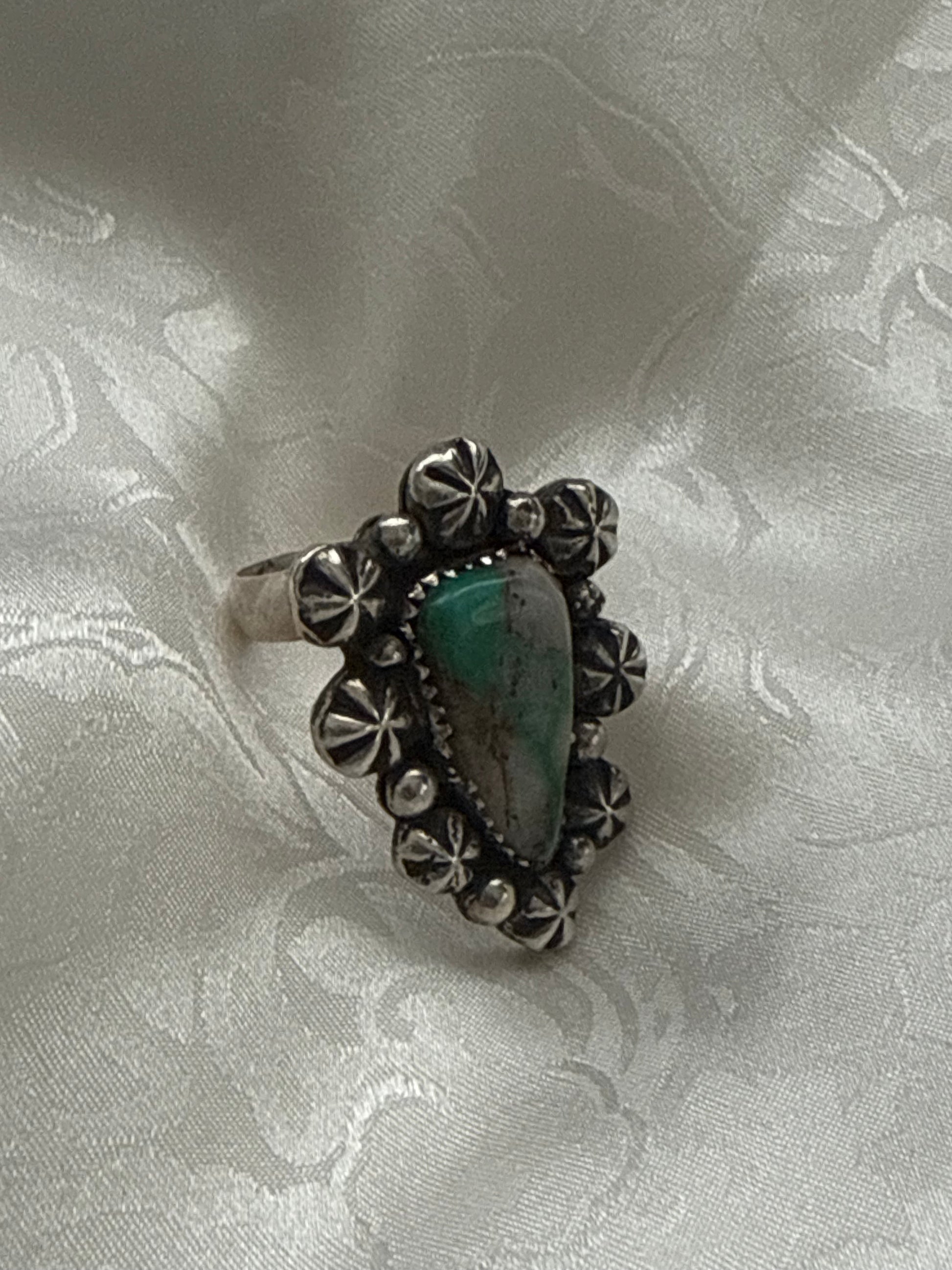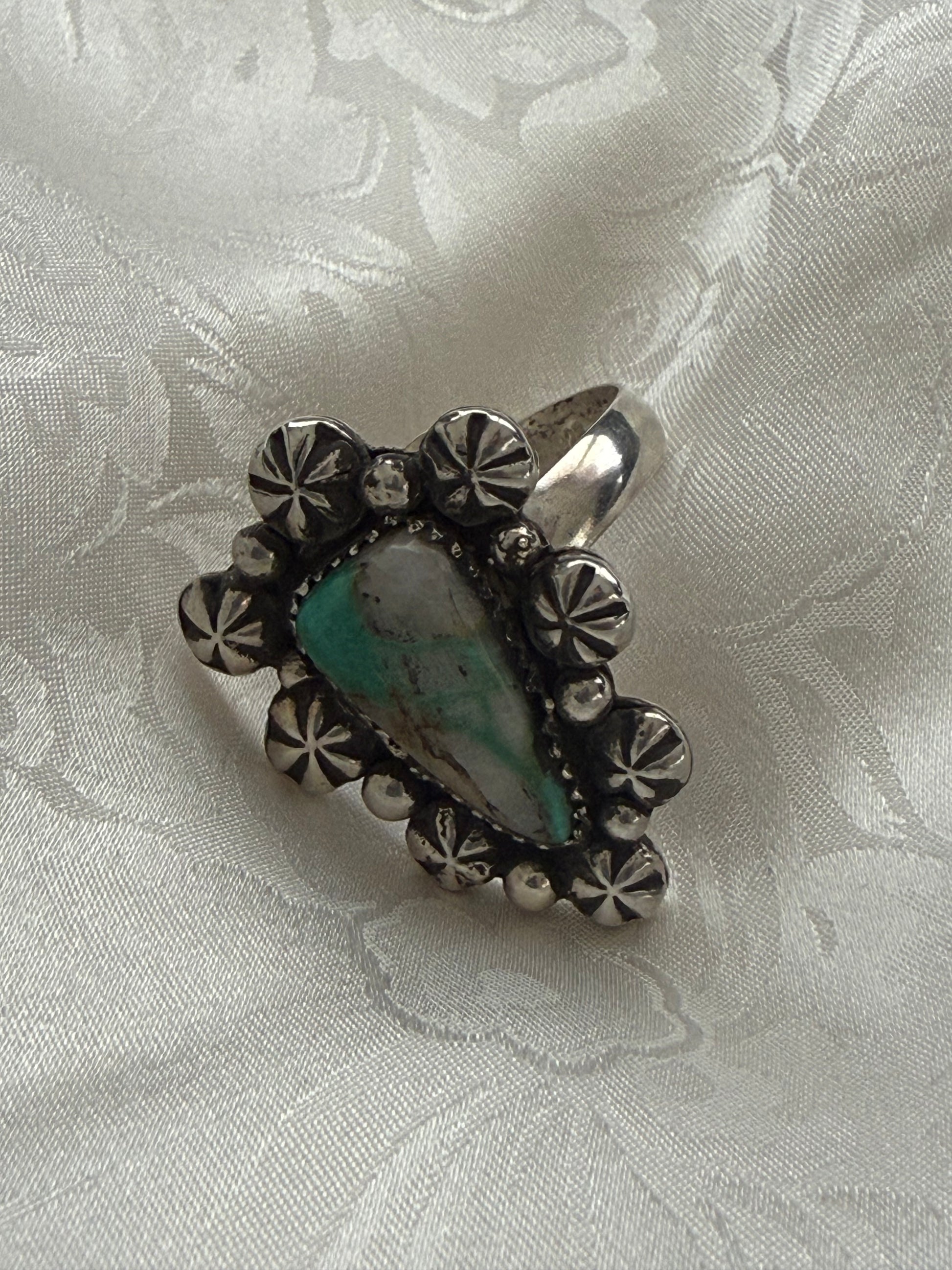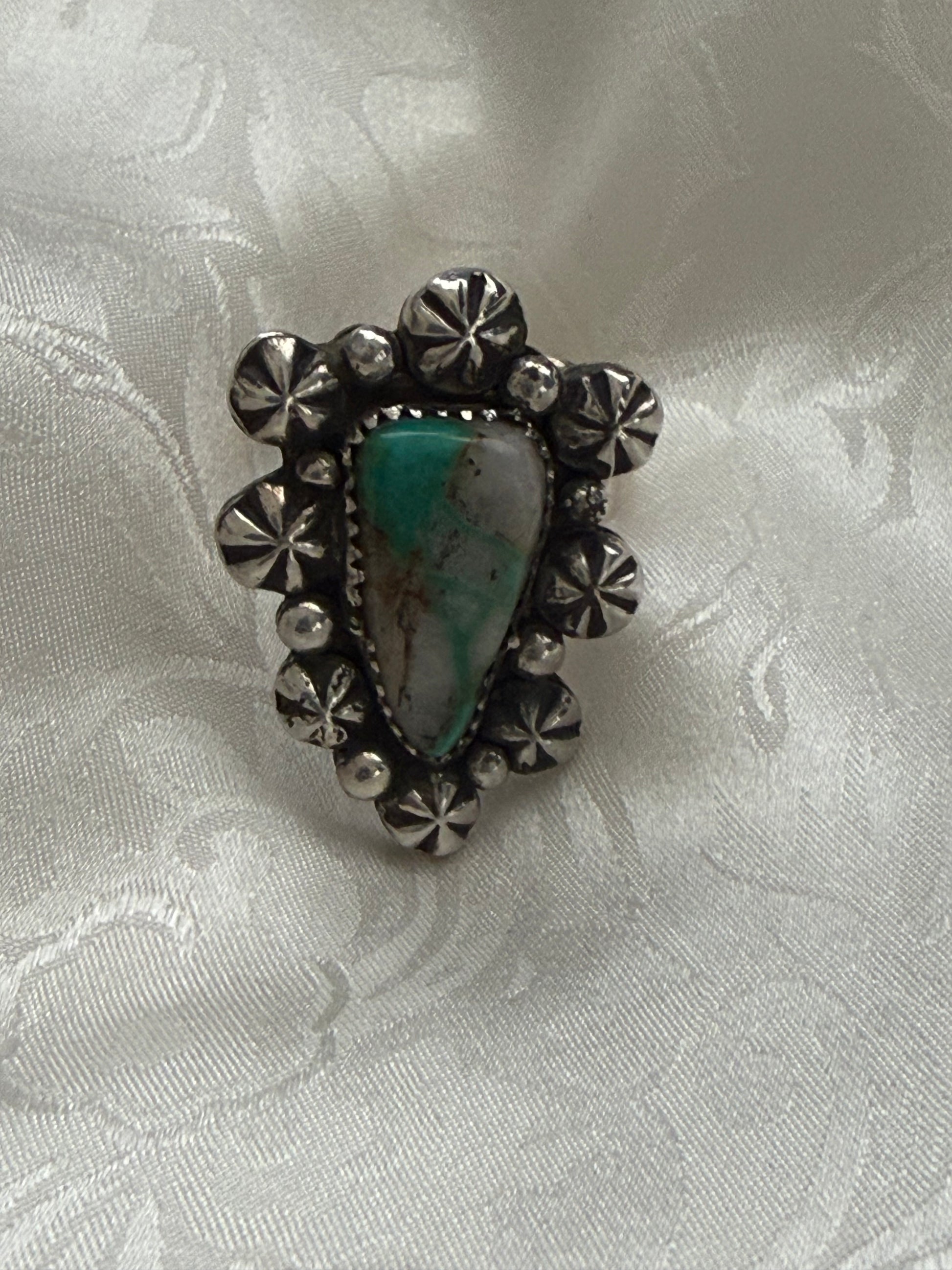 Cat Ballou is a daring and glamorous adjustable sterling silver ring, featuring the vibrant Royston Ribbon Turquoise stone framed by silver shot accents and delicate silver drops. Named for the iconic Western heroine with flair and personality, this ring celebrates retro Western glamour and playful sophistication. Each stone is unique, making every ring a one-of-a-kind collectible statement piece.
